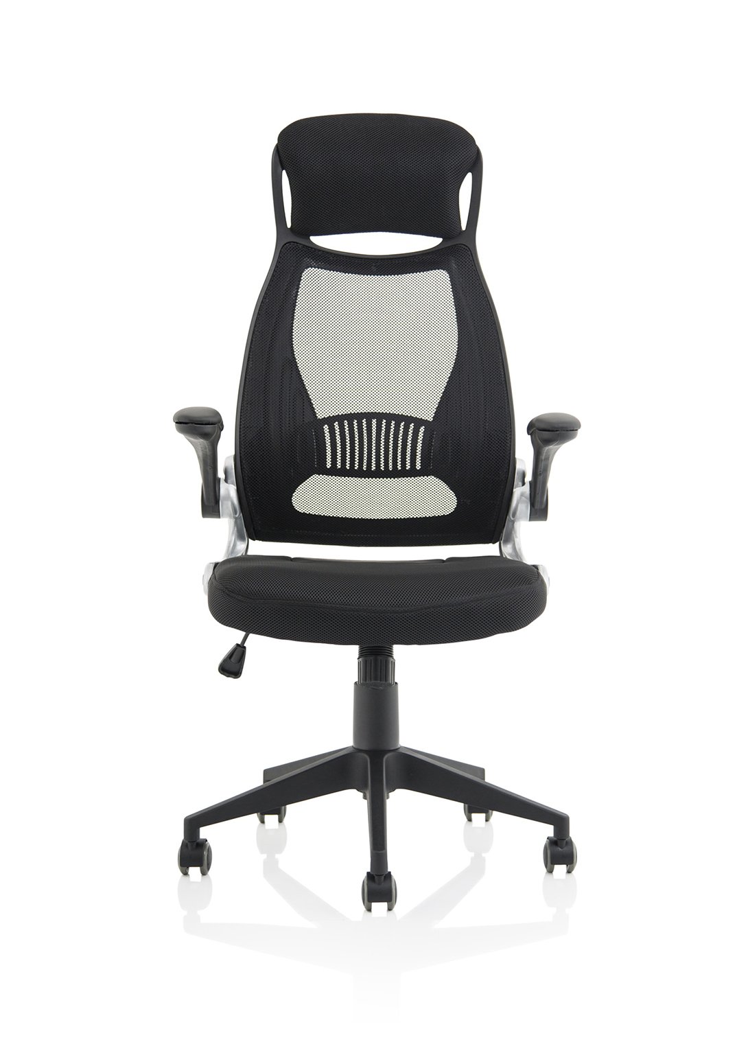 Experience effortless comfort and style with the Saturn High Mesh Back Black Executive Office Chair. Designed to help you glide through your workday, this chair features a soft-touch, breathable airmesh seat paired with fabric-padded armrests on a sleek flip-back silver framemaking close desk work easier than ever. The extra-deep airmesh headrest provides superior support for your upper body and head, while the single lever rock and lock mechanism allows smooth adjustment to your preferred seating position.