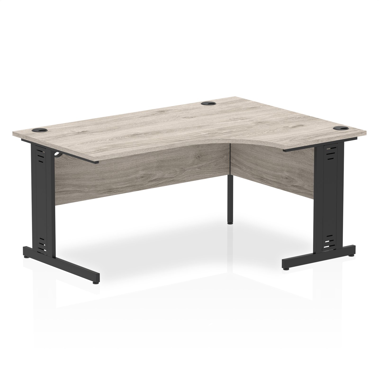 Fitted with strong silver double strut cable managed legs and three integrated cable ports, this desk ensures effective cable routing for a neat, clutter-free workspace. Height-adjustable feet and steel-to-steel fixings offer enhanced stability and durability, making this crescent desk ideal for high-traffic, multi-user settings.